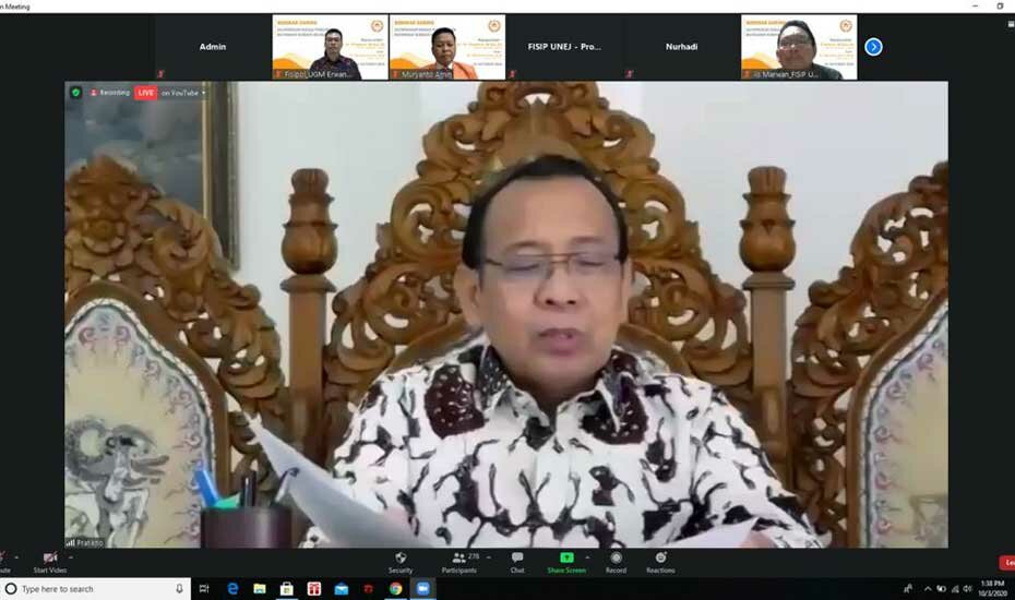 Ketua Fordekiis, Armit Arsyad dalam sambutannya mengatakan bahwa forum yang merupakan wadah kerjasama antara dekan-dekan ilmu sosial menyajikan webinar dengan materi yang sangat menarik dan relevan dengan kondisi Indonesia saat ini, sehingga perlu diikuti dengan baik.