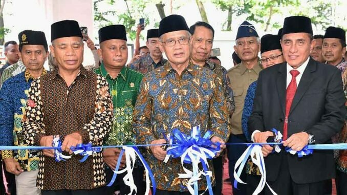 MEDAN | Ketua Umum (Ketum) PP Muhammadiyah Prof H Haedar Nashir, Gubernur Sumatera Utara (Gubsu) H Edy Rahmayadi, Ketua PW Muhammadiyah Sumut Prof H Hasyimsyah Nasution MA menggunting pita sebagai tanda peresmian Gedung Dakwah Muhammadiyah Sumatera Utara (Sumut) di Jl Sisingamaraja Medan pada Sabtu (27/5/2023). Setelah itu, prasasti peresmian gedung pun ditandatangani.