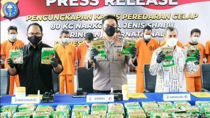 PEKANBARU | Direktorat Reserse Narkoba Polda Riau berhasil meringkus 11 orang tersangka dan barang bukti (barbut) 80 kg narkoba jenis sabu. Sabu masuk lewat perairan di Dumai. Komplotan ini dikendalikan oleh seorang warga binaan Lembaga Pemasyarakatan (Lapas) di Kabupaten Bengkalis berinisial IL yang kemudian juga turut ditangkap Polisi.