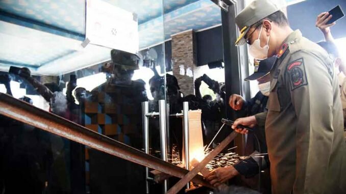 Tidak hanya dipasangi spanduk penyegelan, pintu diskotik juga dipalangi besi dan kemudian dilas.