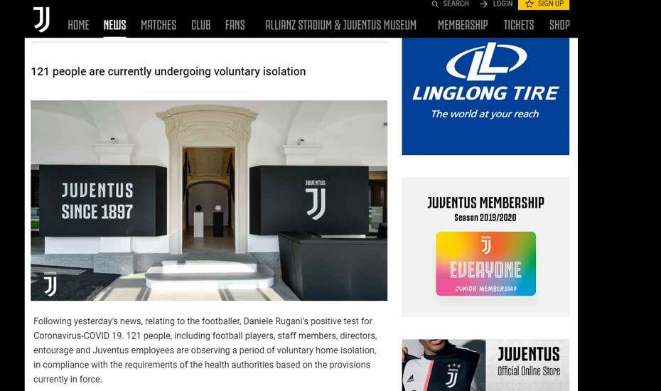 “Menyusul berita kemarin, terkait dengan pemain sepak bola, Daniele Rugani yang dites positif Coronavirus-COVID 19. 121 orang, termasuk pemain sepak bola, anggota staf, direktur, rombongan dan karyawan Juventus sedang didiamati dalam periode isolasi di rumah secara sukarela, sesuai dengan persyaratan dari otoritas kesehatan berdasarkan ketentuan yang berlaku saat ini,” demikian pernyataan Juve yang disiarkan terakhir Kamis (12/3/2020) pukul 19:15 waktu Italia.